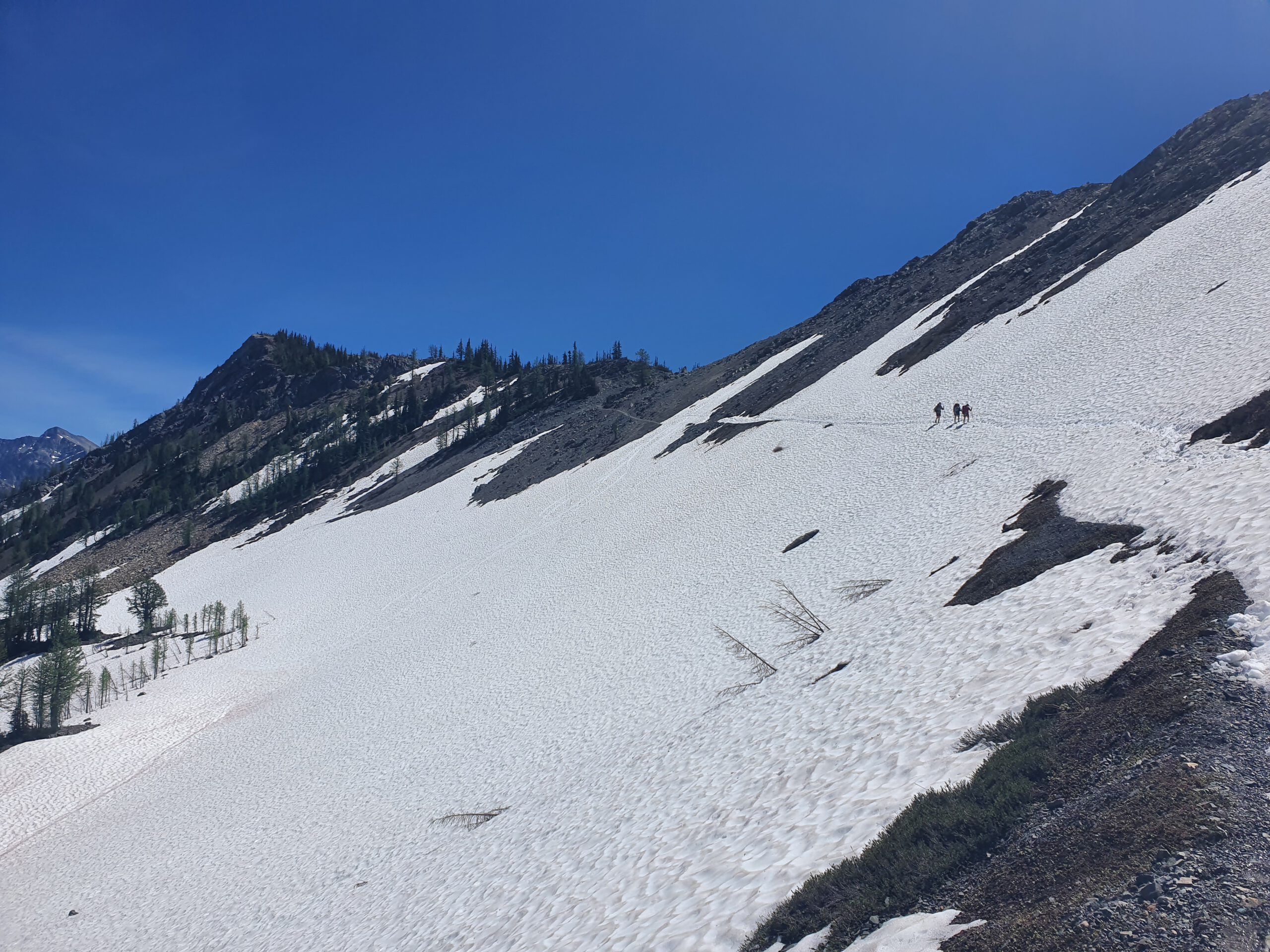 Um 6 Uhr bei angenehmen 32 °C geht’s zum Rocks Pass. Die Cornice ist quasi verschwunden, also geht’s dort hoch. Nicht wirklich schwieriger als die anderen Pässe, solange man nicht stolpert und abrutscht. Ich habe aber gehört, das kommt nirgends in den Bergen besonders gut. Damit sind wir die ersten, die diesen Pass dieses Jahr von Nord nach Süd überqueren. Anbei mein Mitgefühl an alle, die die alternative Route über den Robinson’s Creek Trail zurück gewählt haben. Man erkennt diejenigen sehr leicht an den Beinen mit etwas Resthaut.