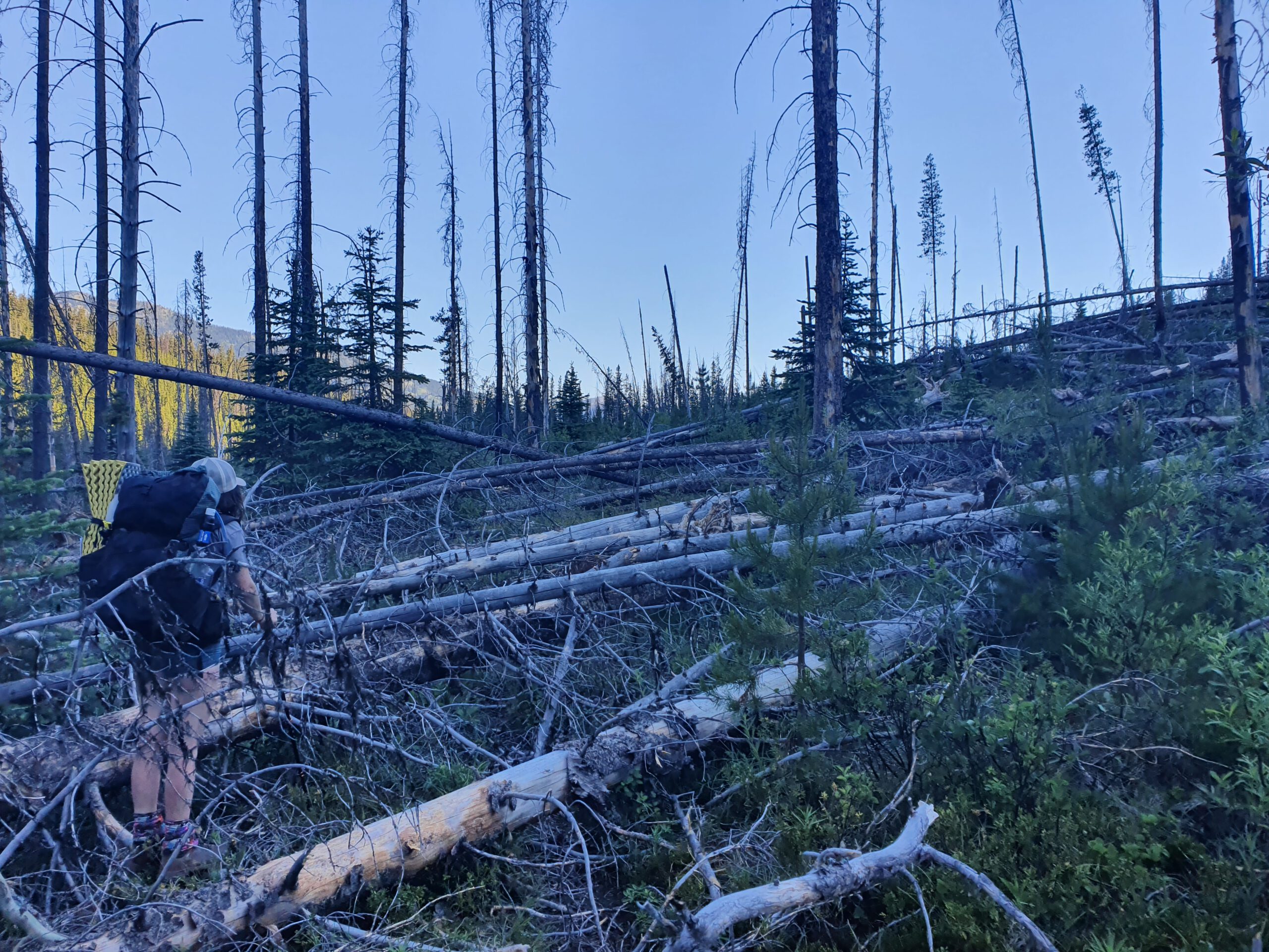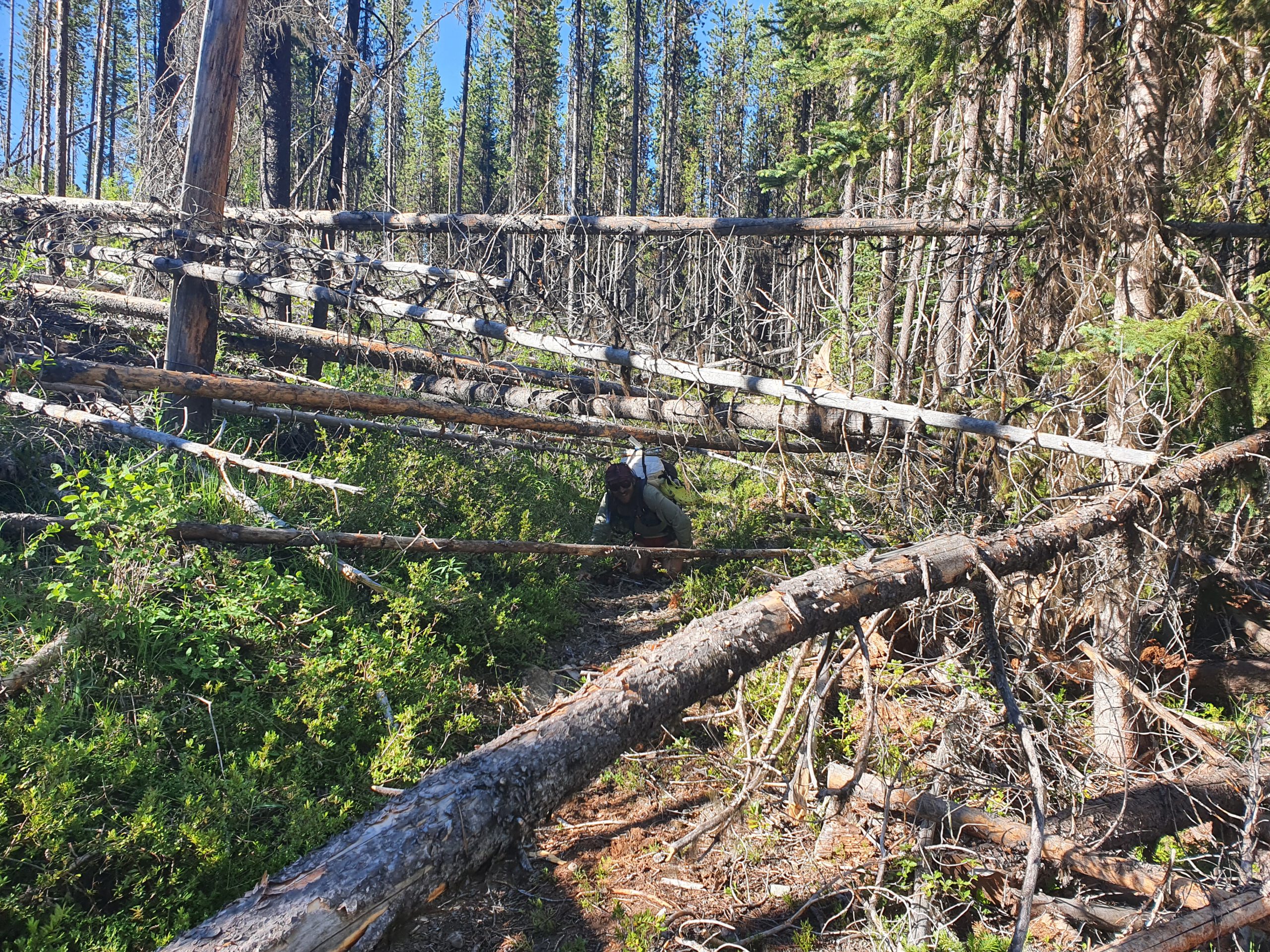 Wir nehmen die alternative Route, die nach Aussage des Rangers ein entspanntes cruisen ist und fragen uns auf was der Ranger cruised. Wir haben mit den meisten Blowdowns, also Bäumen die über den Trail geweht wurden, zu tun, die jeder von uns je gesehen hat. Wir schätzen die Anzahl auf mehr als 500. Das verlangsamt das vorankommen gewaltig! Zum Glück werden wir nach diesen ersten interessanten ca. 20 km belohnt: Mehr Blowdowns, urwaldartiges Dickicht, Flussquerungen und Washouts bei mehr als 40 °C und mit tausenden Moskitos. Wir führen aber einen Weg die Motivation oben zu halten. Mittagspause und Baden im Dead Lake. Ja, mit den Klamotten – 10 kühle Minuten.