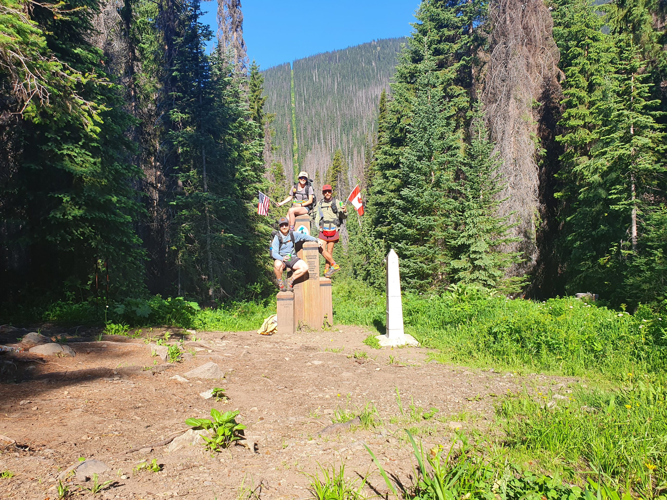 In der Nacht hören wir ein größeres Tier zwischen und um unsere Zelte herum laufen, können dieses aber für’s erste vertreiben. Ich mein, ich habe mich eh sicher gefühlt. Mein Essen hing im Baum, während das Essen der anderen beiden vor deren Zelten lag. Was für einen Besucher wir hatten, können wir jedoch auch am nächsten Morgen nicht feststellen, da wir frische Fußballdrucke von Bären, Großkatzen und Rehen finden. Egal, jetzt geht’s an Tag 3 endlich zur kanadischen Grenze und unseren offiziellen PCT Startpunkt. Auf dem Trail, ca. 1 km von unserem Camp entfernt, trifft Zoe auf einen braunen Schwarzbär, der vor ihr flieht. Ich ziehe mich nach etwa 5 km auf dem Trail gerade um und werde dabei von einem – diesmal schwarzen – Schwarzbären, der 20 Meter vor mir verdutzt den Trail kreuzt, überrascht. Wechseln wir die Hose halt nochmal. Am Monument werden natürlich fleißig Bilder gemacht und unsere schneegekühlten Start-Biere getrunken.