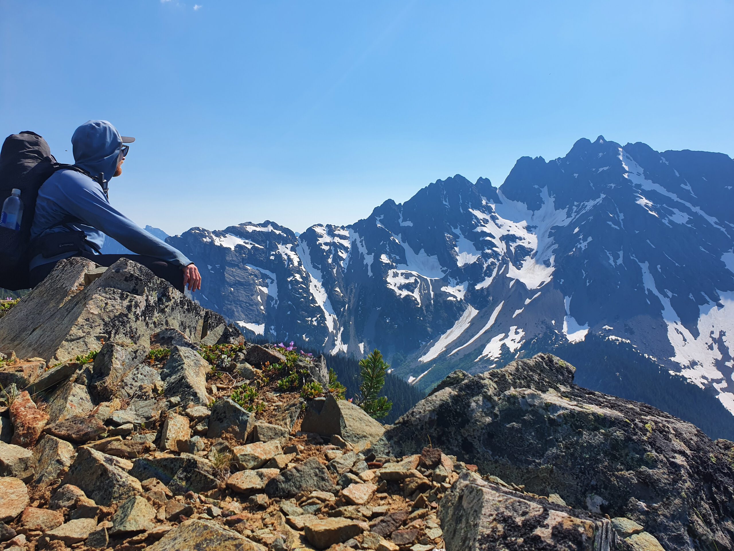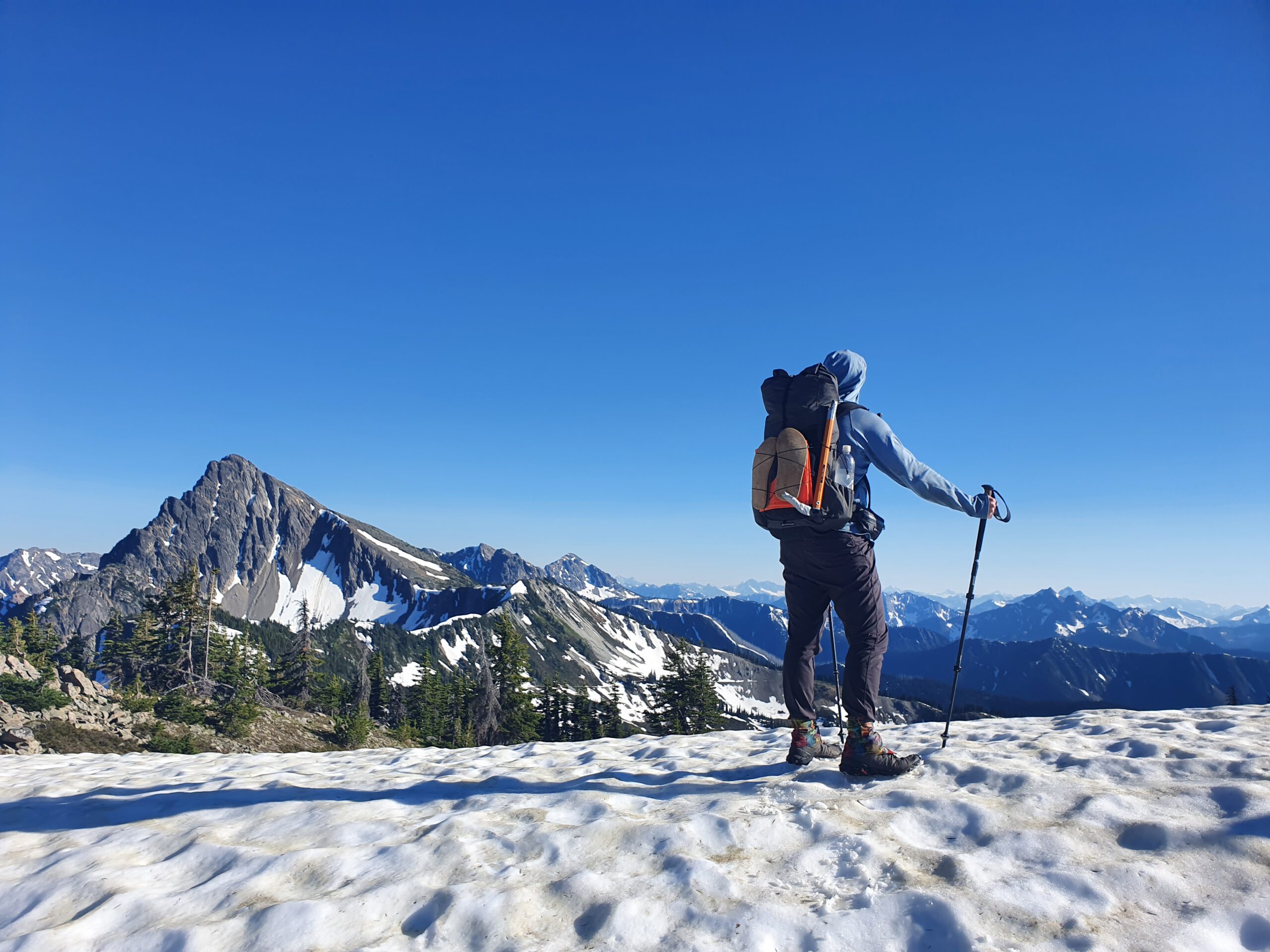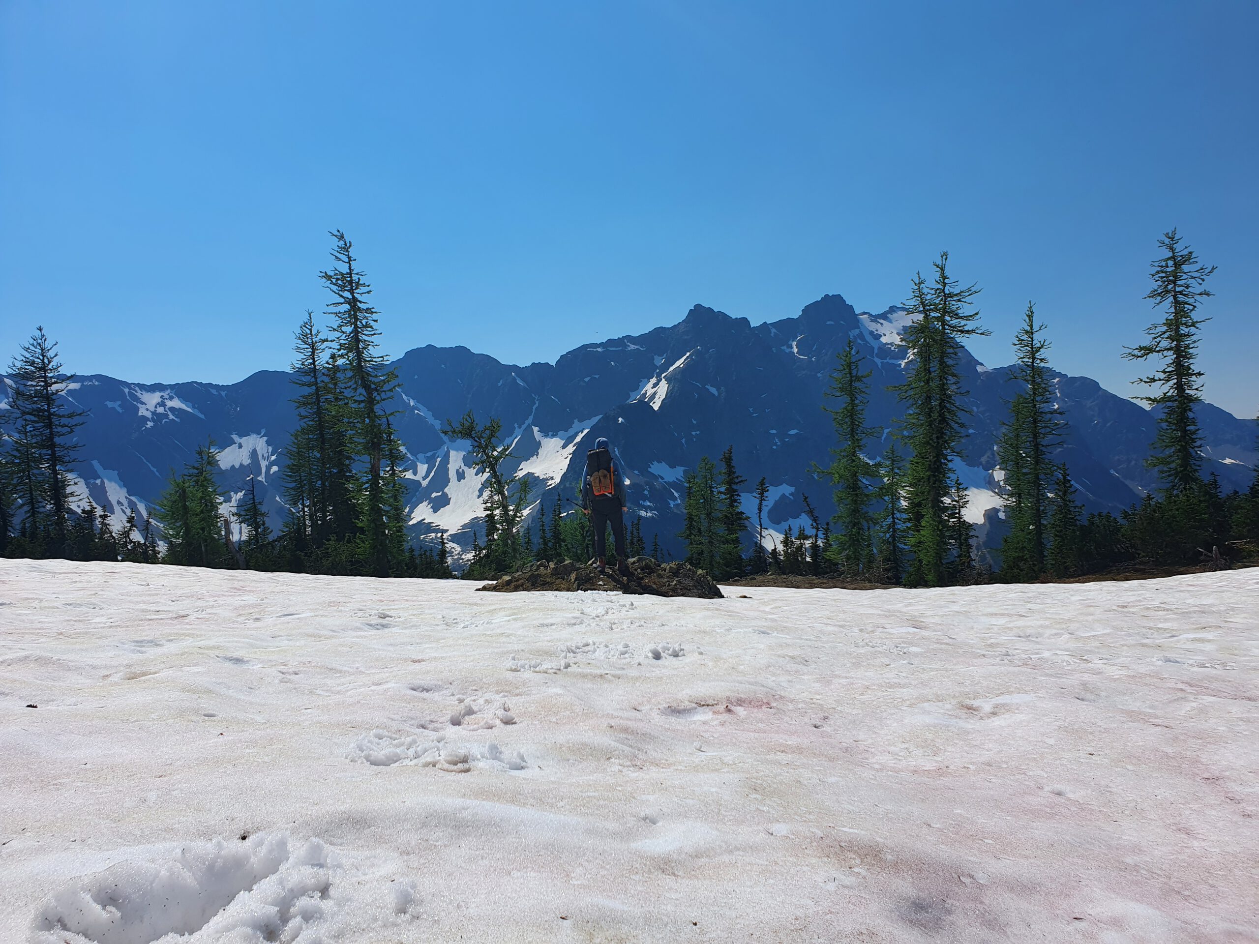 Am nächsten Morgen erreichen wir wieder Hart’s Pass, an dem wir gestartet sind. Wir haben hier am Start Essen und Bier für den Weg in Richtung Stehekin in einer Bärenbox gelagert. Die noch immer wolkenlose Aussicht auf den Weg zum Zwischenziel, Glacial Pass, raubt einem den Atem. Zugleich bekommt man aber auch knallhart die Auswirkungen der Waldbrände vorgelegt. Jared und ich campen schon um 17 Uhr auf dem Glacial Pass im Schnee, weil wir am nächsten Tag die kühleren Morgenstunden nutzen wollen. Wir vermuten, dass Zoe etwas weiter gewandert ist. Jared macht mich um 2 Uhr wach, weil er meint ein Tier zwischen den Zelten gehört zu haben. Ich bin begeistert, weil ich jetzt natürlich richtig Druck auf der Blase habe. Meine Frage ist nur: Ist es ein Raubtier? Er weiß es nicht. Woher sollte er auch, also gehe ich mitten in der Nacht mit meiner Kopflampe und der Eisaxt bewaffnet barfuß über den Schnee zum nächsten Baum und erleichtere mich während ich versuche Geräusche in der Umgebung einzuordnen. So stell ich mir Urlaub vor! Danke, Jared!