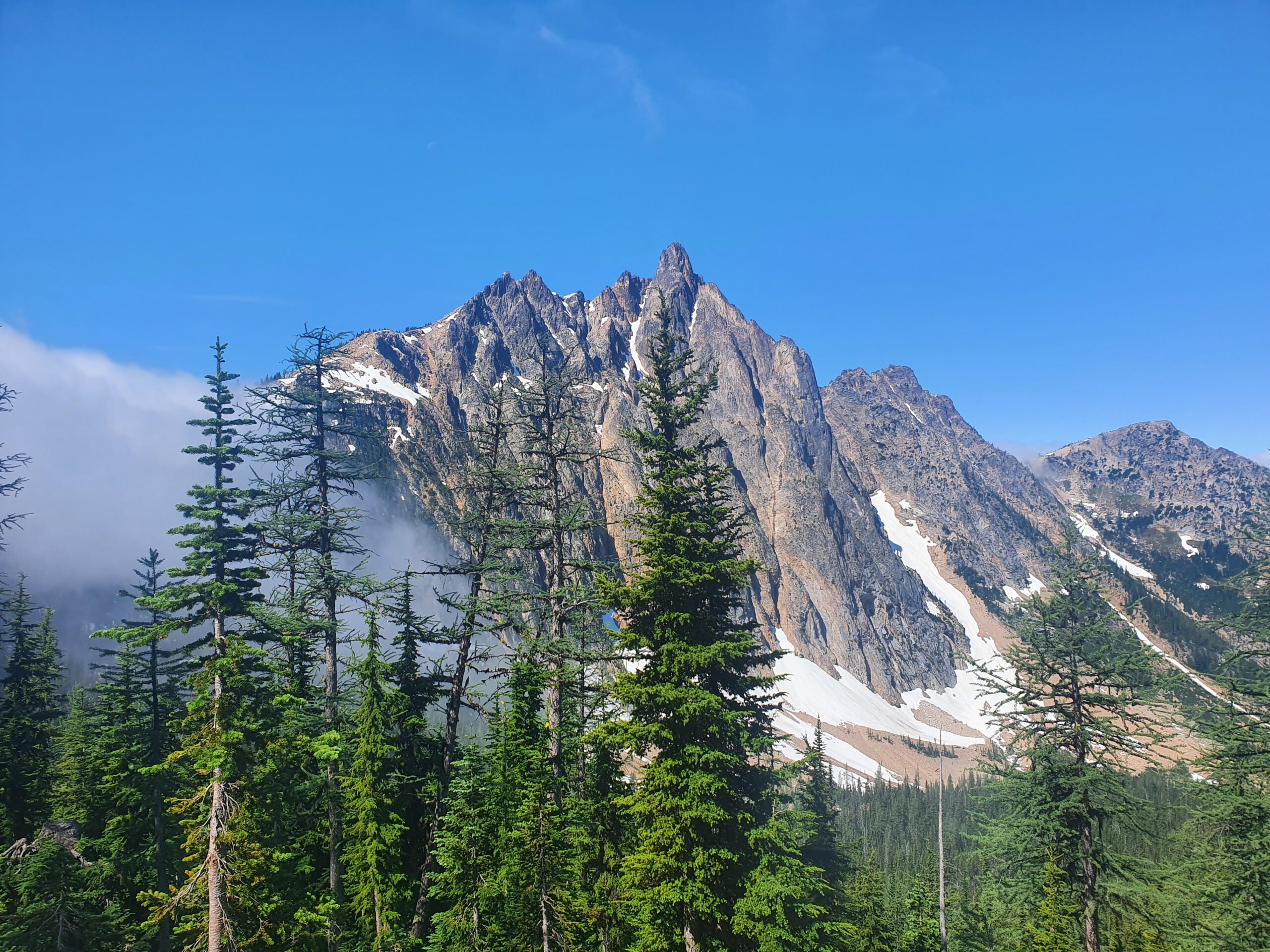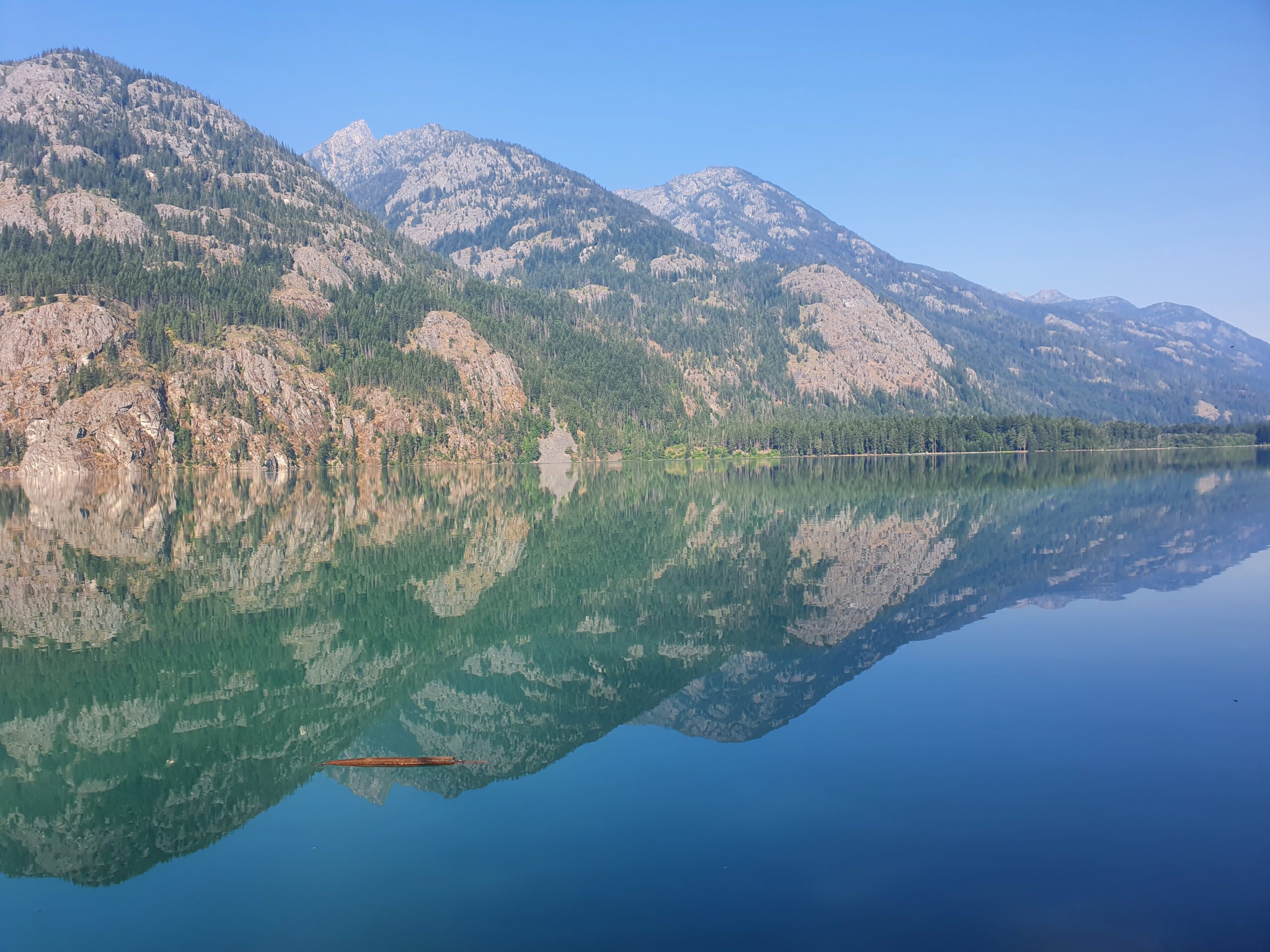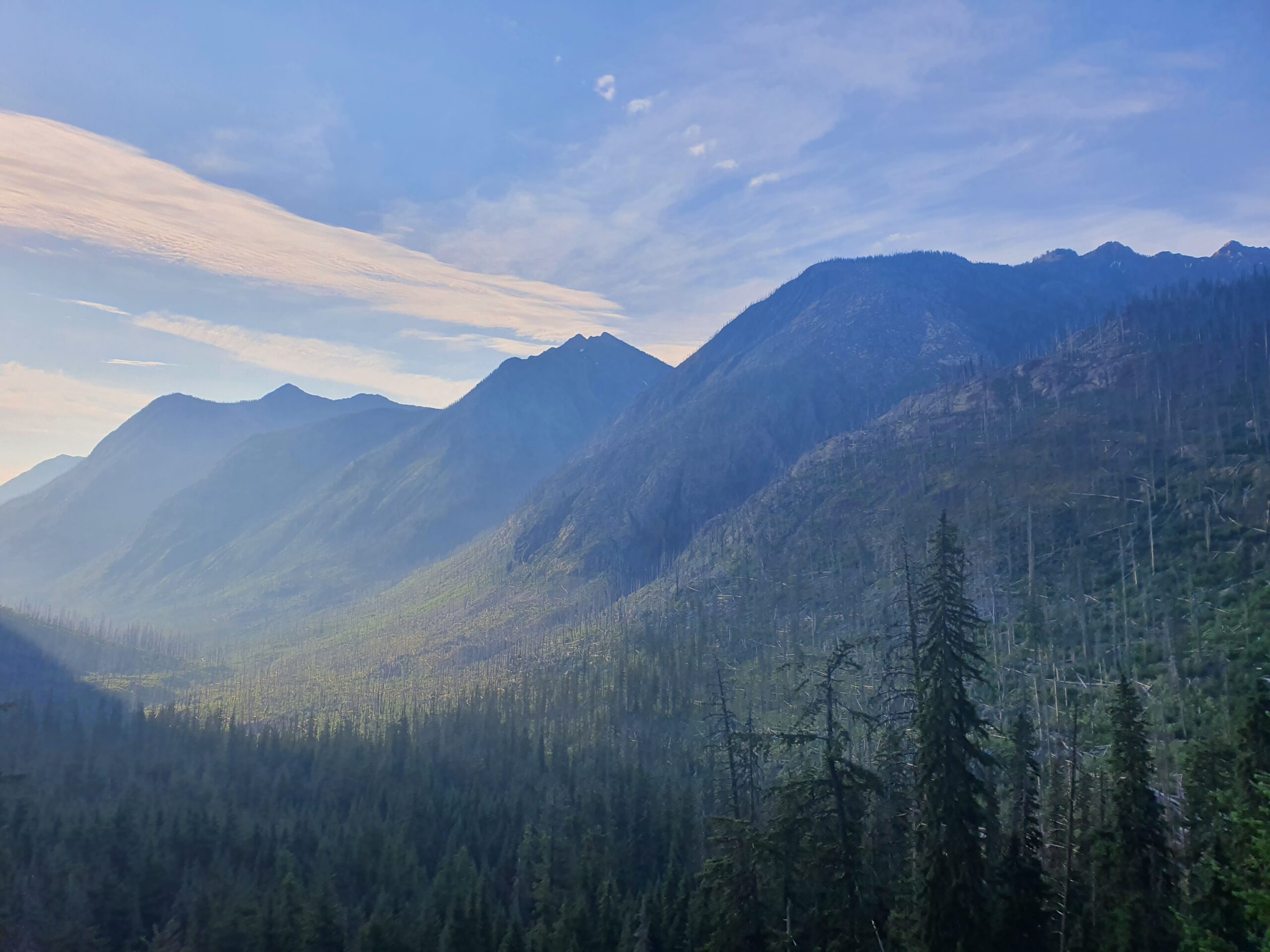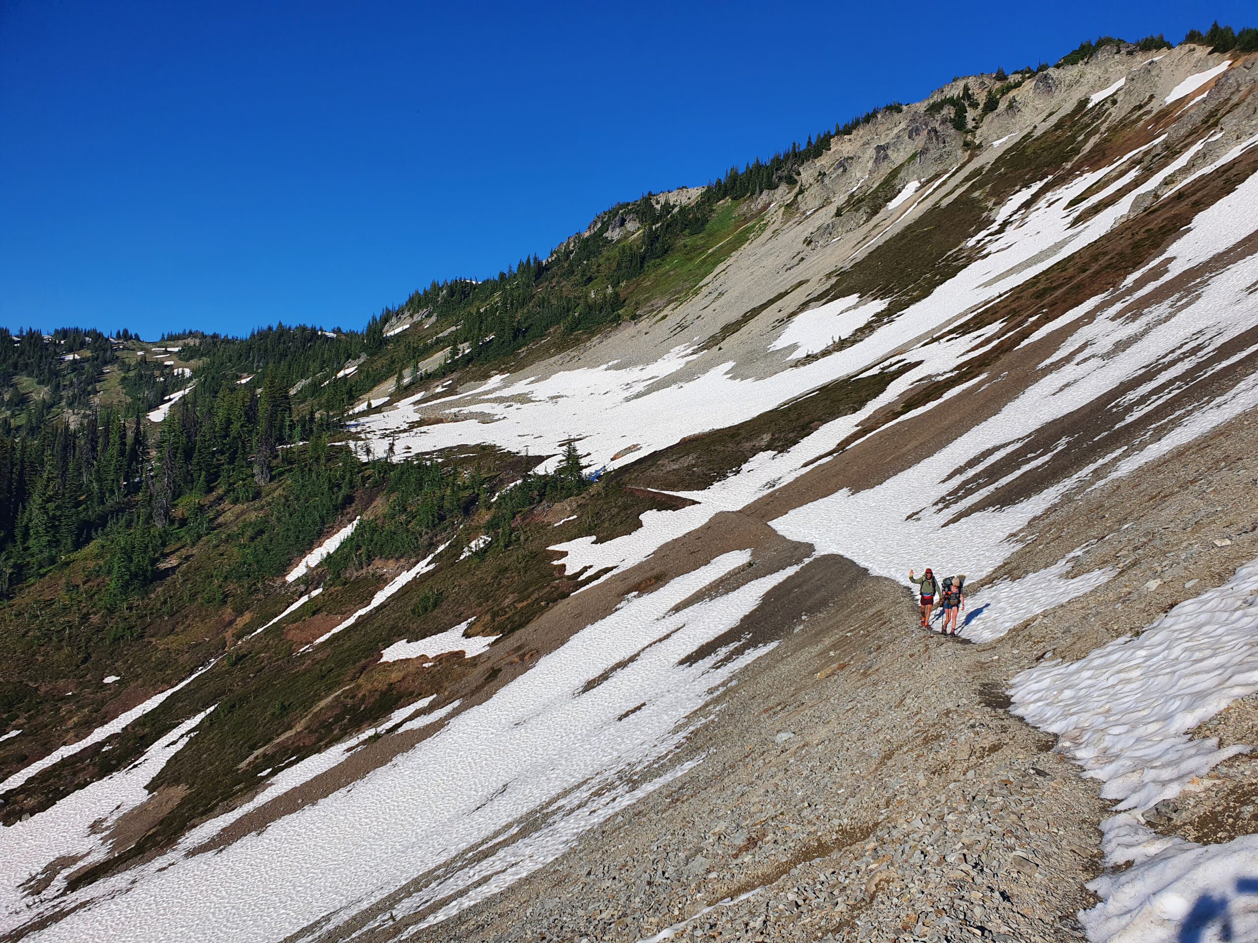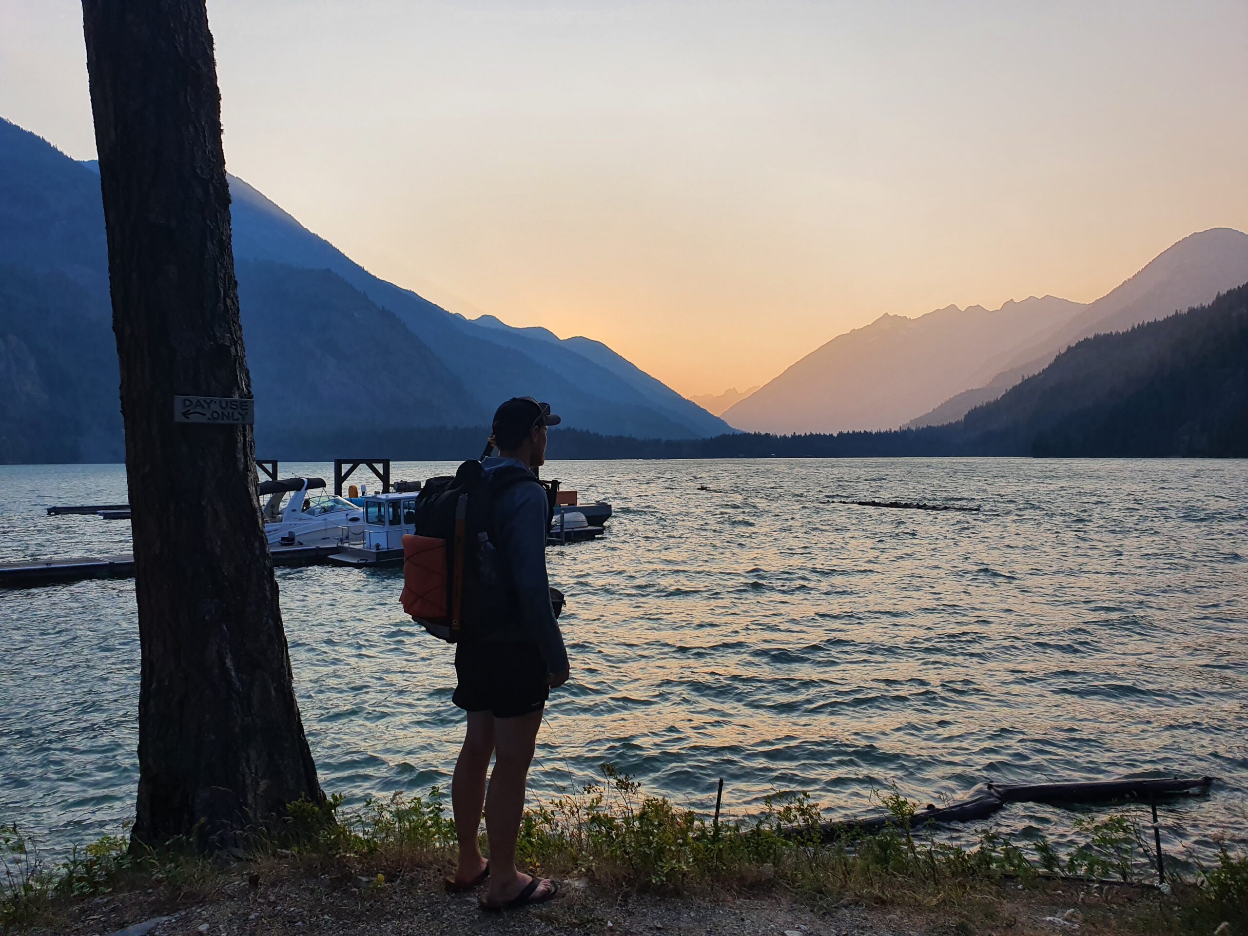 Wir erfahren leider nach schon einigen Kilometern, dass wir nach wie vor eine Reroute nehmen müssen, weil eine Brücke weggespült wurde und der Fluss nicht überquerbar ist. Anfangs ist die Reroute überraschend gut in Takt, später dürfen wir uns jedoch bei steilem Anstieg wieder durch Blowdowns kämpfen. Am Ende gehen wir nicht die Serpentinen, sondern den Berg gerade hoch – Das fühlt sich einfacher an. Später bin ich froh, dass ich mit ein paar extra Tagen gestartet bin. Bei einer schneebedeckten Flussquerung trete ich durch den Schnee und mein rechter Unterschenkel wird von der Strömung verdreht. Autsch! Kurze Zeit später versuchte ich herauszufinden wo ich auf der Reroute Campen kann. Ich würde die verbleibenden 20 km bis Stehekin gerne auf morgen früh verschieben, doch der einzige erlaubte Camp-Spot liegt bereits hinter mir. Ich gehe langsam weiter, muss aber die Zeit im Auge behalten, damit ich die Strecke vor der Dämmerung schaffe. Kurz vor Stehekin treffe ich Jared, der gerade seine erste Bären Erfahrung gesammelt und kurzzeitig mit seinem Leben abgeschlossen hat. Wir kommen nach einem harten Tag zusammen in Stehekin an. Natürlich 10 Minuten zu spät für den Shop und das Restaurant. Es wird ohne Zelt unter freiem Himmel gecamped und wir freuen uns auf den ersten Zero day in dieser wunderschönen Umgebung.